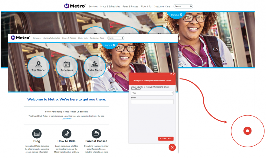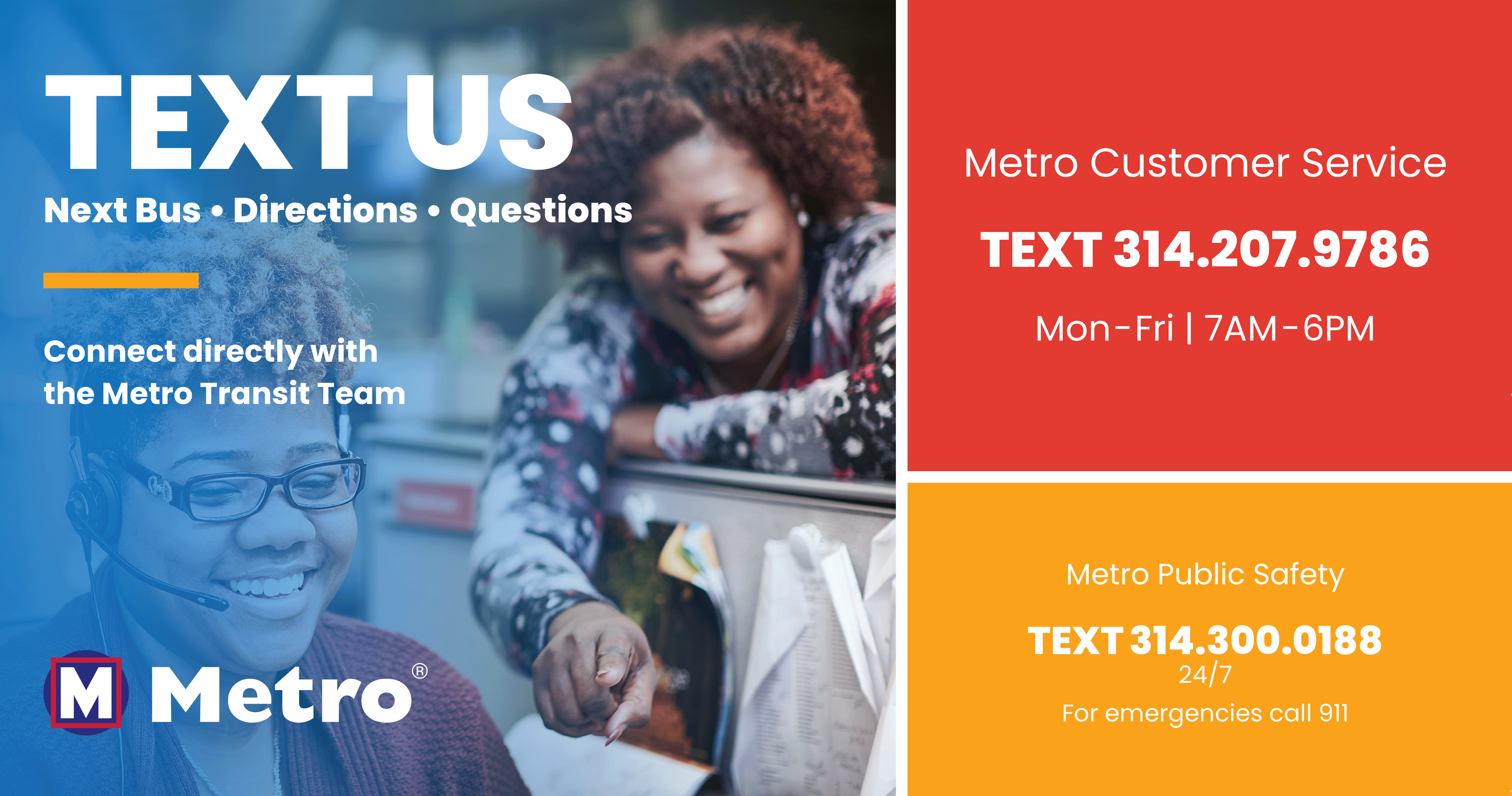 In addition to the new text features, you can also contact Metro Customer Service directly through the Metro Transit website. Click on the new red chat icon, located on the lower right of every page on metrostlouis.org, to start a conversation with a Metro Customer Service representative using a new web chat feature that works on both computers and mobile devices. The Metro Customer Service web chat is available from 7 a.m. to 6 p.m., Monday through Friday.