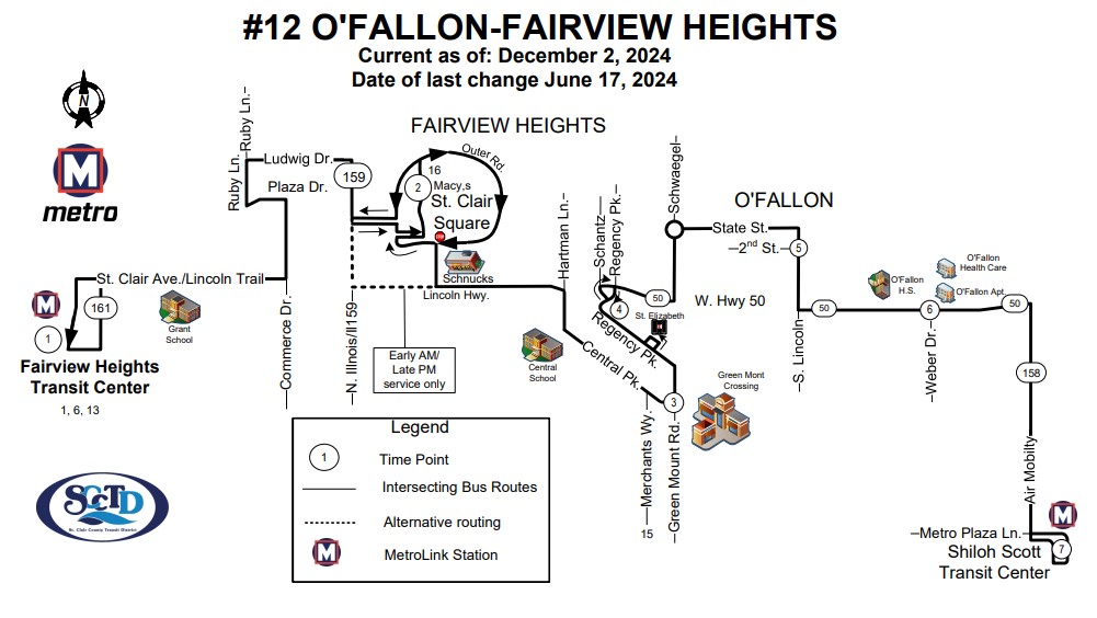 - New Service: Transit Vision 2020 called for increased frequency on #12 O’Fallon-Fairview Heights route. The route will be streamlined to reduce trip times and provide faster service for customers. The bus will provide 20-minute service on weekdays leaving Fairview Heights Transit Center to Highway 50 and Regency Park, with all trips serving St. Elizabeth Hospital. However, the route will now leave Regency Park to continue on Highway 50 and Highway 158 – not providing service to Cambridge, 1st Street and Smiley – traveling to the Shiloh-Scott Transit Center every 40 minutes on weekdays.