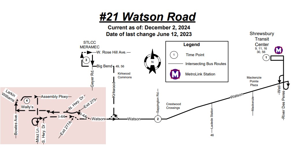 - Route will alternate trips between Watson-at-Kirkwood and Fenton, and Watson-at-Kirkwood and St. Louis Community College at Meramec: 60-minute frequency (daytime weekdays) | 80-minute frequency (nights and weekends)