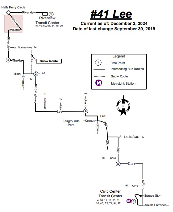 - New Service: Route will serve Halls Ferry between Riverview and McLaran (previously served by #174X), with service to senior living and the public library.